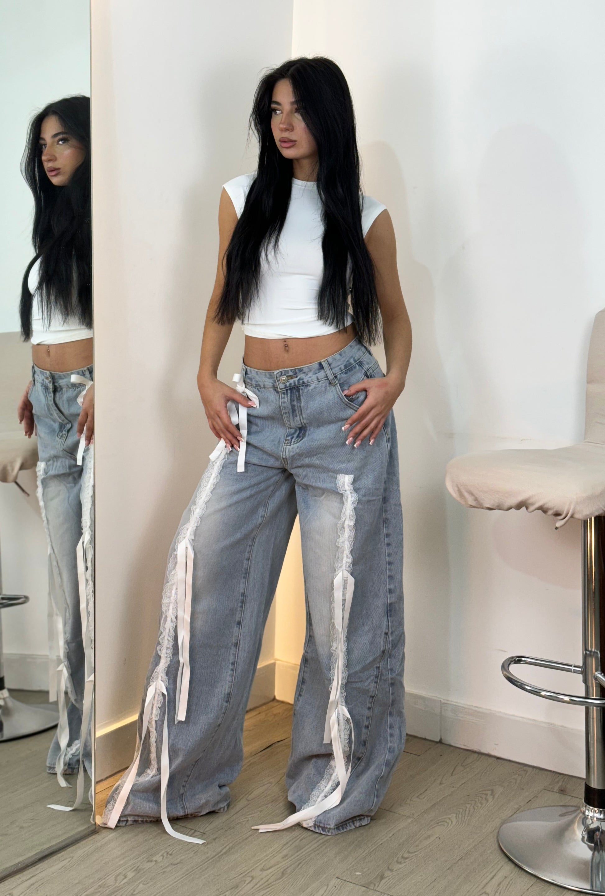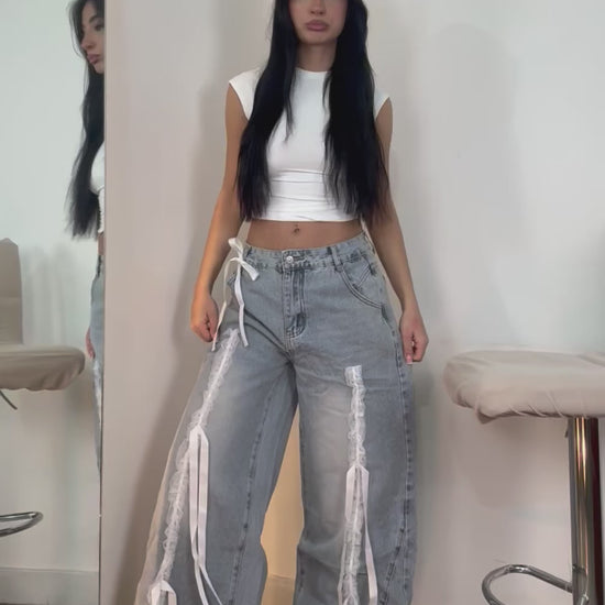 Jeans con dettagli in tessuto, S-M-L, la modella indossa S, calza regolare