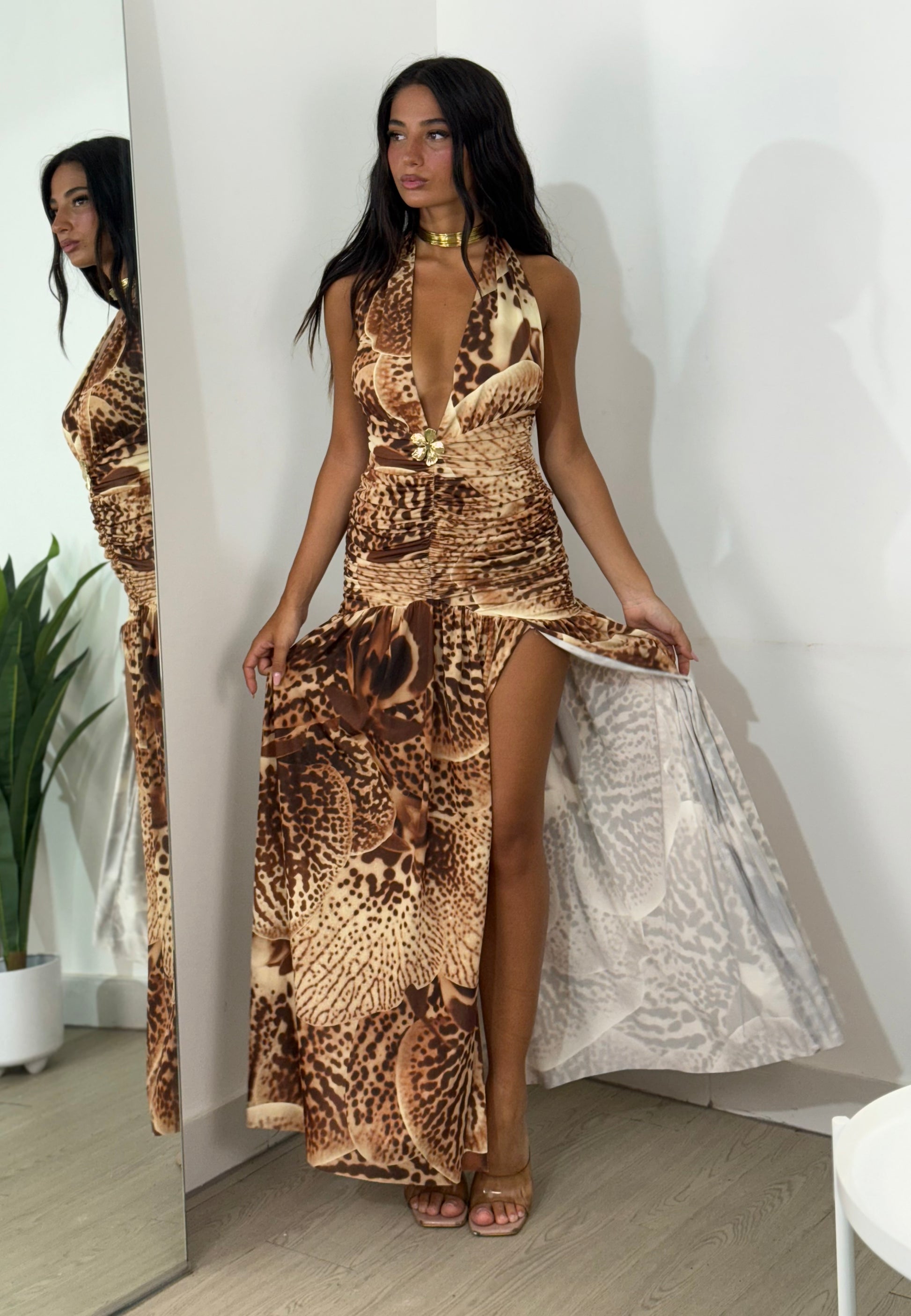 Dress con spilla fiore al centro, taglia unica con spacco, regolabile sul collo