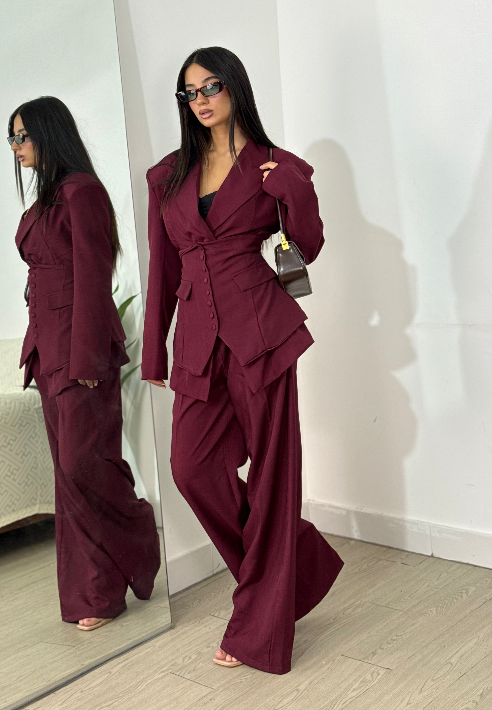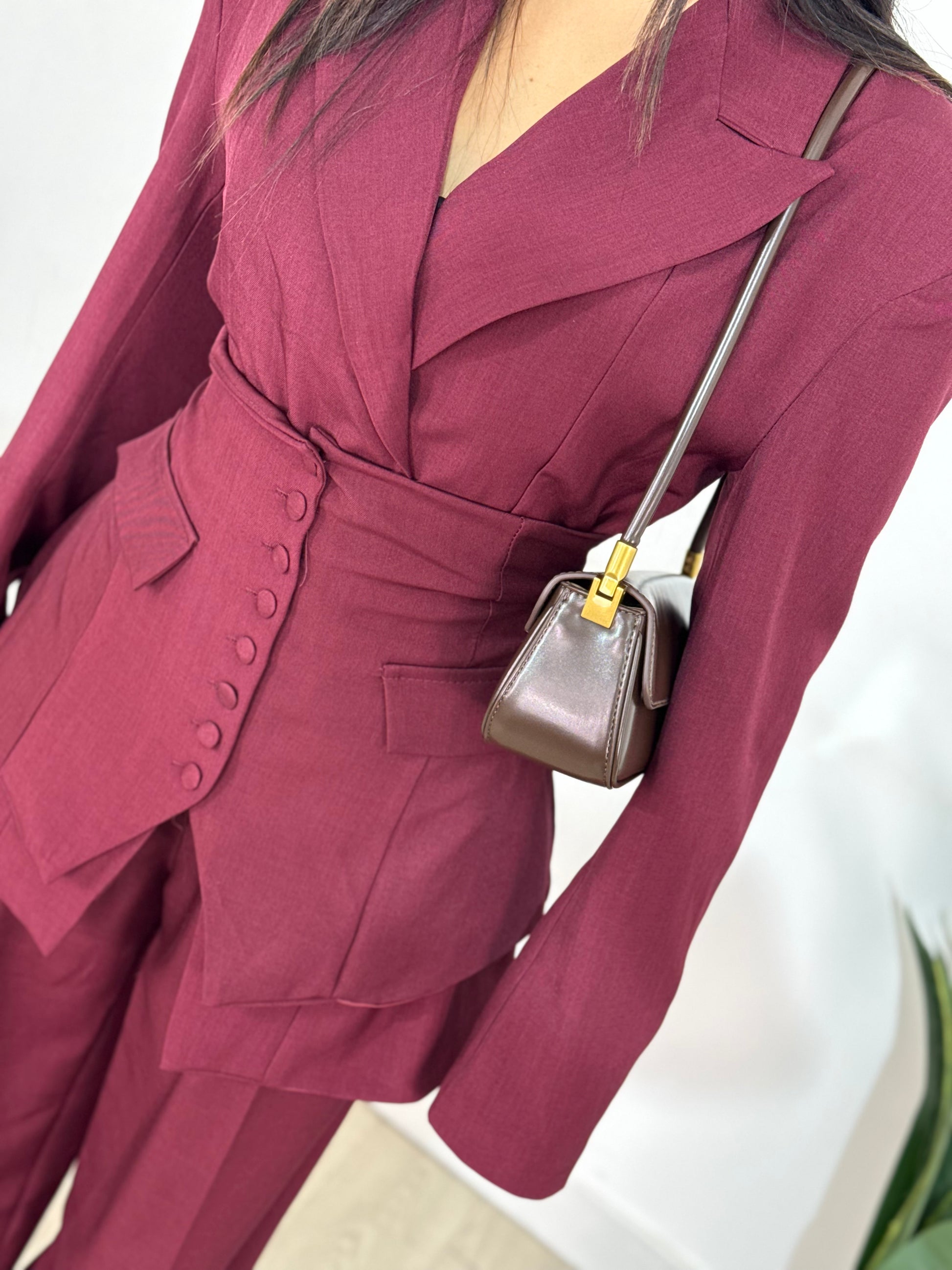 Tailleur taglia unica composto da tre pezzi: giacca, bustino e pantalone super elastico